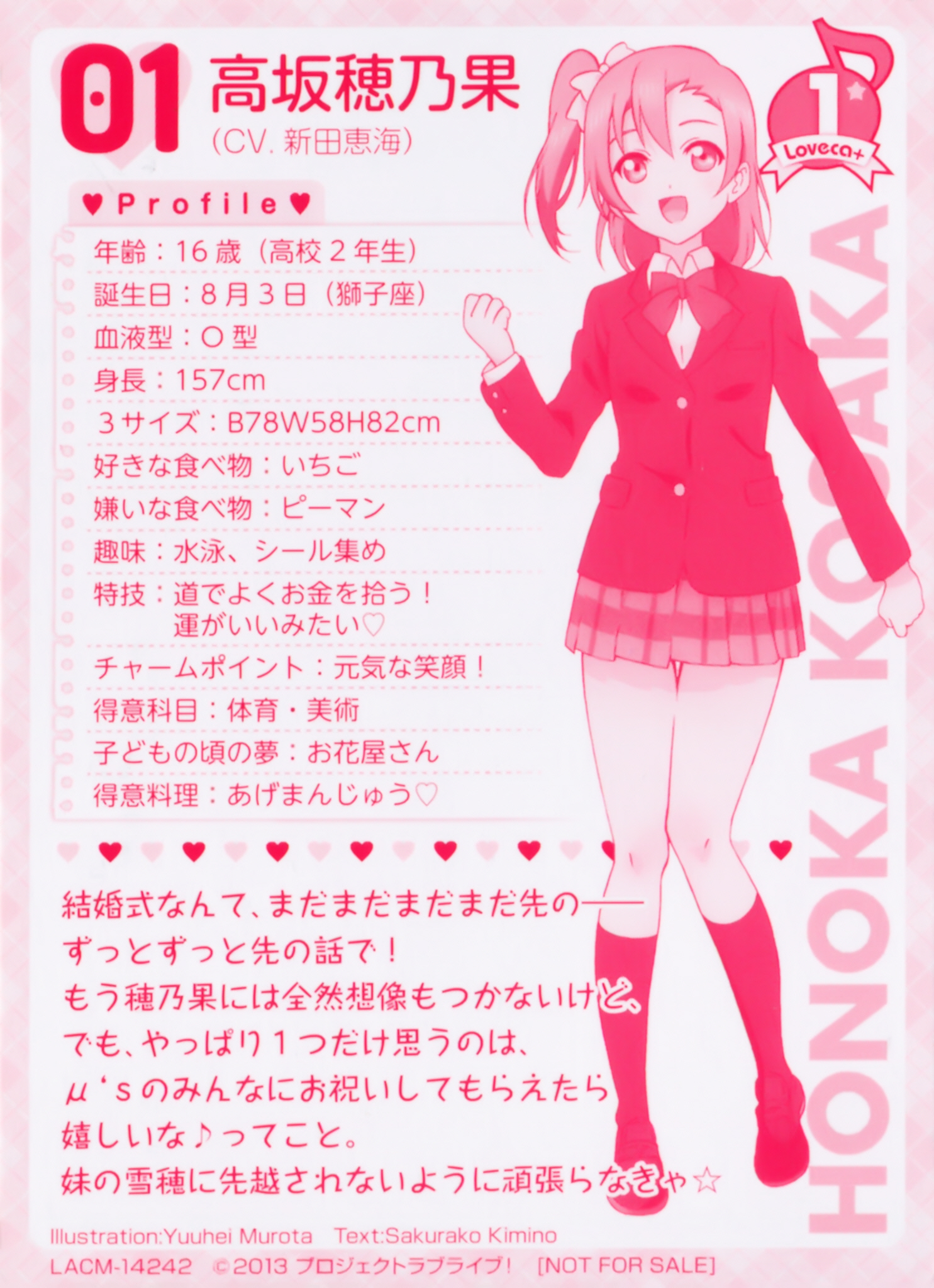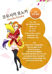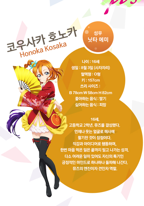 코사카 호노카 (KOUSAKA HONOKA)|高坂穂乃果 나이 16 생일 08.03 혈액형 O 신장 157cm 사이즈 78-58-82 프로필 [로그] [정보수정] 폐교를 막기 위해 '스쿨아이돌'을 만들기로 결심하고 앞장서서 아이돌 활동을 해나가는 노력가로, 밝고 쾌활한 성격의 소유자. 집은 화과자 가게를 하고 있어서 팥이라면 질색한다. 좋아하는 음식은 딸기. 설정화 [설정화 등록] 삭제삭제 명대사 [명대사 등록] 수정삭제오늘도 빵이 맞있어! 러브 라이브! 더 스쿨 아이돌 무비 (LOVELIVE THE School idol Movie, 2015)|2015.09.03 러브 라이브! 2기|2014.04.06 러브 라이브!|2013.01.06