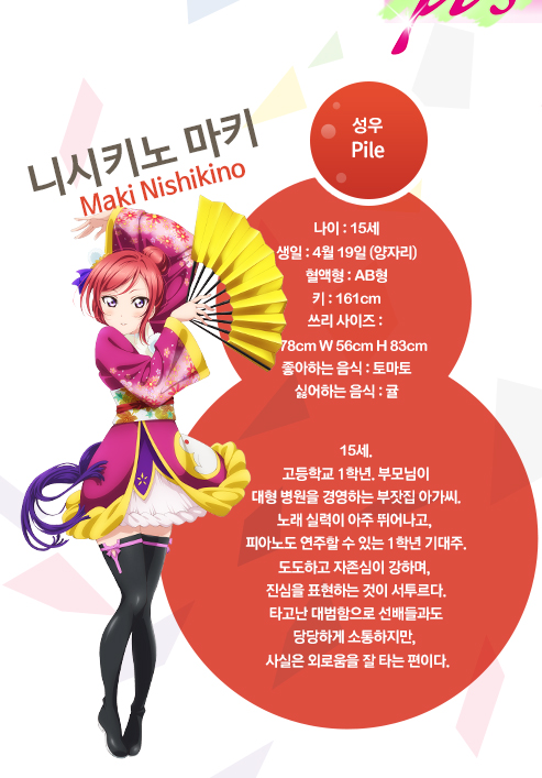 니시키노 마키 (NISIKINO MAKI)|西木野真姫 (にしきの まき) 나이 15 생일 04.19 혈액형 AB 신장 161cm 사이즈 78-56-83 프로필 [로그] [정보수정] 노래를 매우 좋아해 방과 후 매일 음악실에서 피아노를 치며 노래를 부른다. 노래를 매우 잘 부름. 호노카가 그 노래를 듣고 같이 스쿨 아이돌을 할 것을 권하지만 거절. 하지만 결국 들어간다. 설정화 [설정화 등록] 삭제 명대사 [명대사 등록] 명대사를 등록하여주세요. 러브 라이브! 더 스쿨 아이돌 무비 (LOVELIVE THE School idol Movie, 2015)|2015.09.03 러브 라이브! 2기|2014.04.06 러브 라이브!|2013.01.06