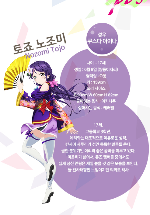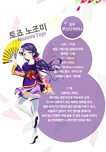 토죠 노조미 (TOZYO NOZOMI)|東條希 (とうじょう のぞみ) 나이 17 생일 06.09 혈액형 O 신장 159cm 사이즈 90-60-82 프로필 [로그] [정보수정] 학생회 부회장. 에리의 친구이며 에리는 μ's을 방해하려는 것에 반해 뒤에서 μ's를 응원한다. 설정화 [설정화 등록] 삭제 명대사 [명대사 등록] 명대사를 등록하여주세요. 러브 라이브! 더 스쿨 아이돌 무비 (LOVELIVE THE School idol Movie, 2015)|2015.09.03 러브 라이브! 2기|2014.04.06 러브 라이브!|2013.01.06