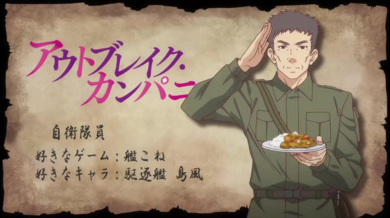 자위대원|自衛隊 프로필 [로그] [정보수정] 카노 신이치를 원래 있던 곳으로 데려다 주거나 데리고 오는 일을 하고 있으며 종종 자위대 일로 모습을 보여주고 있다. 설정화 [설정화 등록] 설정화를 등록하여주세요. 명대사 [명대사 등록] 명대사를 등록하여주세요. 아웃브레이크 컴퍼니|2013.10.04