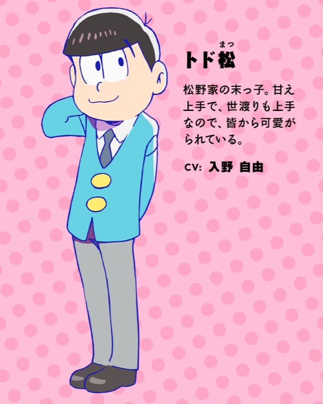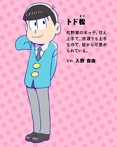 마츠노 토도마츠 (MATSUNO TODOMATSU)|松野トド松 프로필 [로그] [정보수정] 마츠노 가의 막내. 귀여움을 이용하는 야비한 놈. 갑자기 드라이해지는 일면도. 애칭은 톳티 설정화 [설정화 등록] 삭제 명대사 [명대사 등록] 명대사를 등록하여주세요. 오소마츠 씨 (2025)|2025.07.09 오소마츠 씨 (2020)|2020.10.13 오소마츠 씨 (2017)|2017.10.03 오소마츠 씨|2015.10.06 오소마츠 군 (1988)|1988.02.05 오소마츠 군 (1966)|1980.01.01