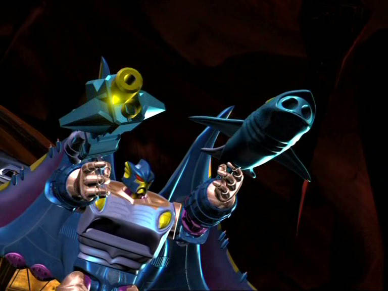 그의 무기는 미사일 런처와 가오리의 꼬리가 창이 되고 가슴에서 디스크를