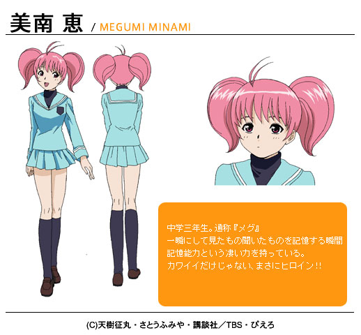 미나미 메구미 (MINAMI MEGUMI)|美南恵 프로필 [로그] [정보수정] Q 클래스의 홍일점. 한 번 본 것은 잊지 않는다는 '순간기억능력' 소유자로 초반까지는 인간 카메라 이상의 구실이 없었지만, 중반이후부터 그녀가 어린시절에 다녔다는 '능력개발 연구소'에 관련 된 떡밥이 조금씩 풀리기 시작한다. 설정화 [설정화 등록] 설정화를 등록하여주세요. 명대사 [명대사 등록] 명대사를 등록하여주세요. 탐정학원Q|2003.04.15