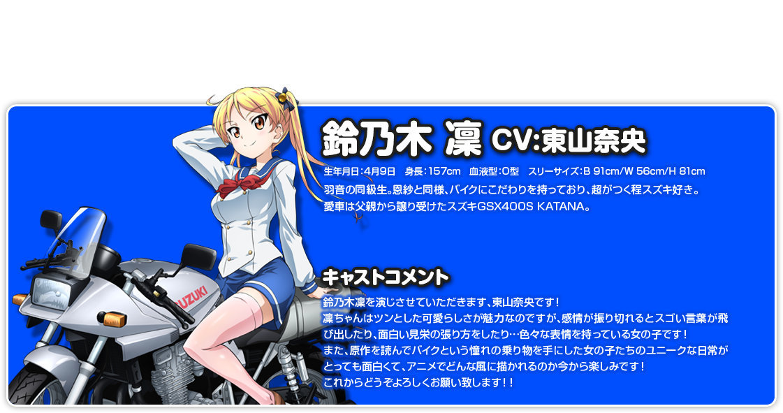 스즈노키 린 (SUZUNOKI RIN)|鈴乃木凛 생일 04.09 프로필 [로그] [정보수정] 프로필을 등록하여주세요. 설정화 [설정화 등록] 삭제삭제 명대사 [명대사 등록] 명대사를 등록하여주세요. 바쿠온!!|2016.04.05