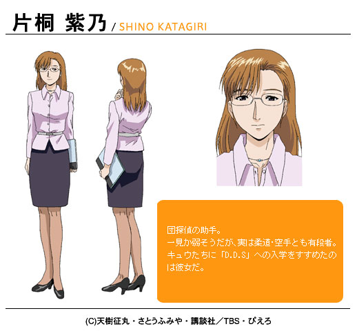 카타기리 시노 (KATAGIRI SHINO)|片桐紫乃 프로필 [로그] [정보수정] DDS의 교사겸 DDC 소속 탐정이라고는 하나 주로 하는 일은 단의 휠체어 밀고 다니기. 설정화 [설정화 등록] 설정화를 등록하여주세요. 명대사 [명대사 등록] 명대사를 등록하여주세요. 탐정학원Q|2003.04.15
