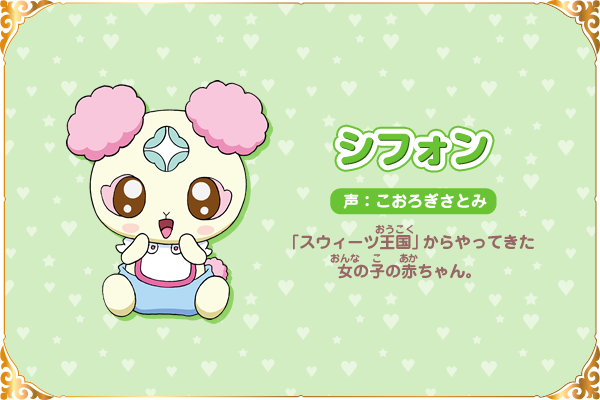 시폰 (SIPON)|シフォン 프로필 [로그] [정보수정] 프로필을 등록하여주세요. 설정화 [설정화 등록] 삭제 명대사 [명대사 등록] 명대사를 등록하여주세요. 도쿄 뮤우뮤우 뉴~♡ (2023)|2023.04.05 허긋토! 프리큐어|2018.02.04 프리큐어 올스타즈 모두 함께 노래하는 기적의 마법!|2016.03.19 프리큐어 올스타즈 봄의 카니발♪|2015.03.14 프리큐어 올스타즈 뉴 스테이지 3 영원한 친구|2014.03.15 프리큐어 올스타즈 뉴스테이지2 마음의 친구|2013.03.16 프리큐어 올스타즈New Stage 미래의 친구들|2012.03.17 프리큐어 올스타즈 dx 3 - 미래에 닿아라! 세계를 잇는☆무지개빛 꽃|2011.03.19 프리큐어 올스타즈DX2 희망의 빛, 레인보우쥬엘을 지켜라|2010.03.20 프리큐어 올스타즈 DX 모두 친구-기적의 전원대집합!|2009.03.20 프레시 프리큐어|2009.02.01