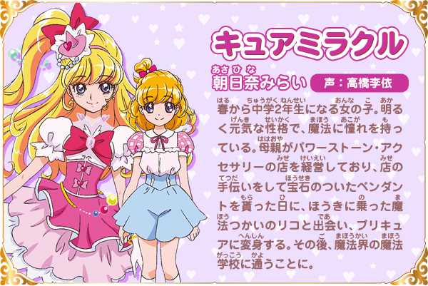 아사히나 미라이 (ASAHINA MIRAI)|朝日奈みらい 프로필 [로그] [정보수정] 프로필을 등록하여주세요. 설정화 [설정화 등록] 삭제 명대사 [명대사 등록] 명대사를 등록하여주세요. 마법사 프리큐어!! ~MIRAI DAYS~|2025.01.12 프리큐어 미라클 유니버스|2019.03.16 허긋토! 프리큐어 ♡ 두사람은 프리큐어|2018.10.27 프리큐어 슈퍼 스타즈!|2018.03.17 허긋토! 프리큐어|2018.02.04 프리큐어 드림 스타즈!|2017.03.18 마법사 프리큐어! - 기적의 변신! 큐어 모후룬!|2016.10.29 프리큐어 올스타즈 모두 함께 노래하는 기적의 마법!|2016.03.19 마법사 프리큐어!|2016.02.07