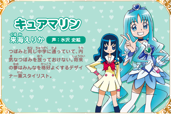 쿠루미 에리카 (KURUMI ERIKA)|来海えりか 프로필 [로그] [정보수정] 프로필을 등록하여주세요. 설정화 [설정화 등록] 삭제 명대사 [명대사 등록] 명대사를 등록하여주세요. 허긋토! 프리큐어 ♡ 두사람은 프리큐어|2018.10.27 프리큐어 올스타즈 모두 함께 노래하는 기적의 마법!|2016.03.19 프리큐어 올스타즈 봄의 카니발♪|2015.03.14 프리큐어 올스타즈 뉴 스테이지 3 영원한 친구|2014.03.15 프리큐어 올스타즈 뉴스테이지2 마음의 친구|2013.03.16 프리큐어 올스타즈New Stage 미래의 친구들|2012.03.17 프리큐어 올스타즈 dx 3 - 미래에 닿아라! 세계를 잇는☆무지개빛 꽃|2011.03.19 프리큐어 올스타즈DX2 희망의 빛, 레인보우쥬엘을 지켜라|2010.03.20 하트 캐치 프리큐어|2010.02.07