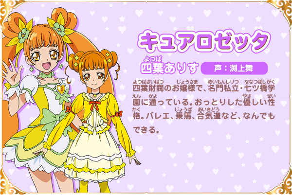 요츠바 아리스 (YOTSUBA ARIS)|四葉ありす 프로필 [로그] [정보수정] 프로필을 등록하여주세요. 설정화 [설정화 등록] 삭제 명대사 [명대사 등록] 명대사를 등록하여주세요. 허긋토! 프리큐어 ♡ 두사람은 프리큐어|2018.10.27 프리큐어 올스타즈 모두 함께 노래하는 기적의 마법!|2016.03.19 프리큐어 올스타즈 봄의 카니발♪|2015.03.14 프리큐어 올스타즈 뉴 스테이지 3 영원한 친구|2014.03.15 프리큐어 올스타즈 뉴스테이지2 마음의 친구|2013.03.16 두근두근 프리큐어!|2013.02.03