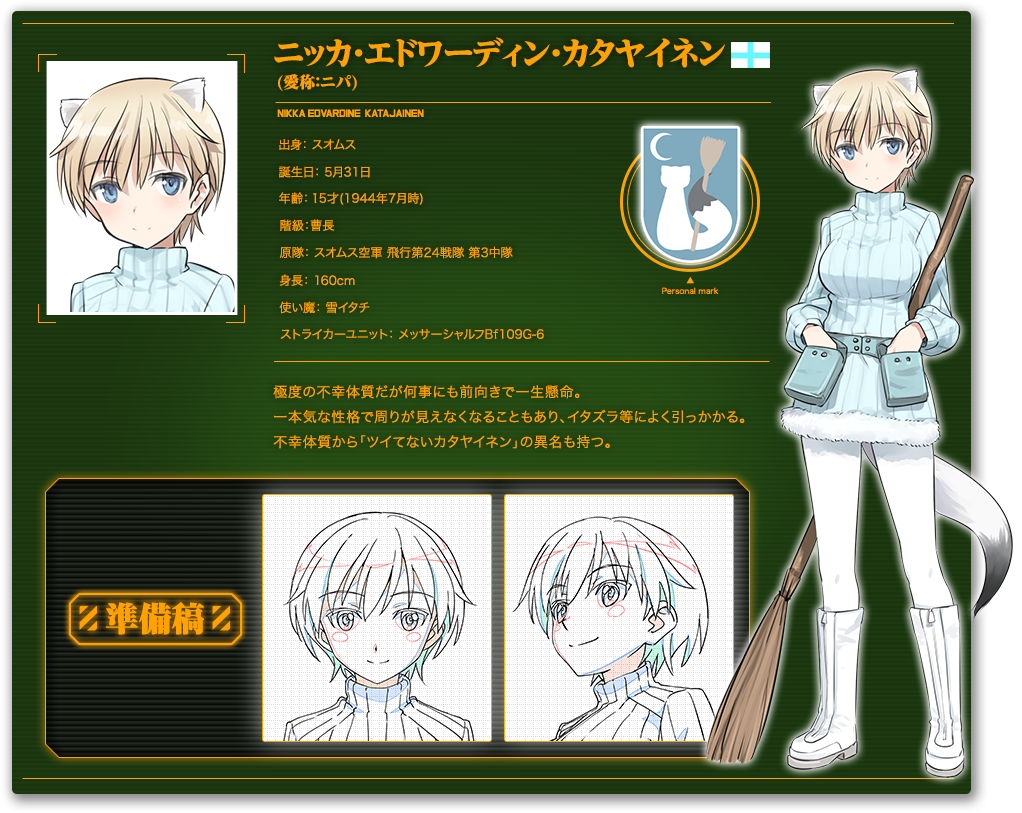 니카 에드버딘 카타야이넨 (NIKKA EDVARDINE KATAJAINEN)|ニッカ・エドワーディン・カタヤイネン 나이 15 생일 05.31 프로필 [로그] [정보수정] 프로필을 등록하여주세요. 설정화 [설정화 등록] 삭제 명대사 [명대사 등록] 명대사를 등록하여주세요. 월드 위치스 발진합니다!|2021.01.13 브레이브 위치스|2016.10.06 스트라이크 위치스 극장판|2012.03.17