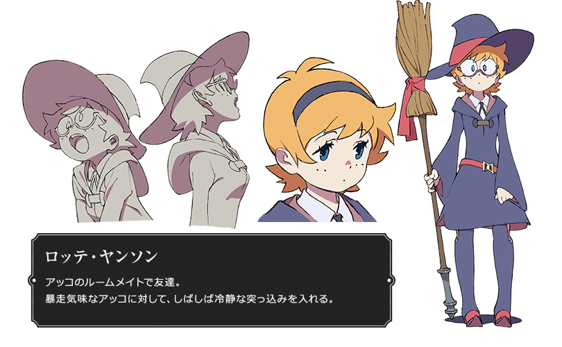 롯테 얀손 (LOTTE YANSON)|ロッテ・ヤンソン 프로필 [로그] [정보수정] 앗코의 친구이다. 안경을 쓰고 있으며 삼인방에서 범생이 포지션을 취하고 있다. 설정화 [설정화 등록] 삭제 명대사 [명대사 등록] 명대사를 등록하여주세요. 리틀 위치 아카데미아 (2017)|2017.01.09