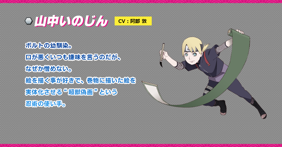 야마나카 이노진 (YAMANAKA INOJIN)|山中いのじん 생일 12.05 프로필 [로그] [정보수정] 프로필을 등록하여주세요. 설정화 [설정화 등록] 삭제 명대사 [명대사 등록] 명대사를 등록하여주세요. 보루토: 나루토 넥스트 제너레이션즈|2017.04.05
