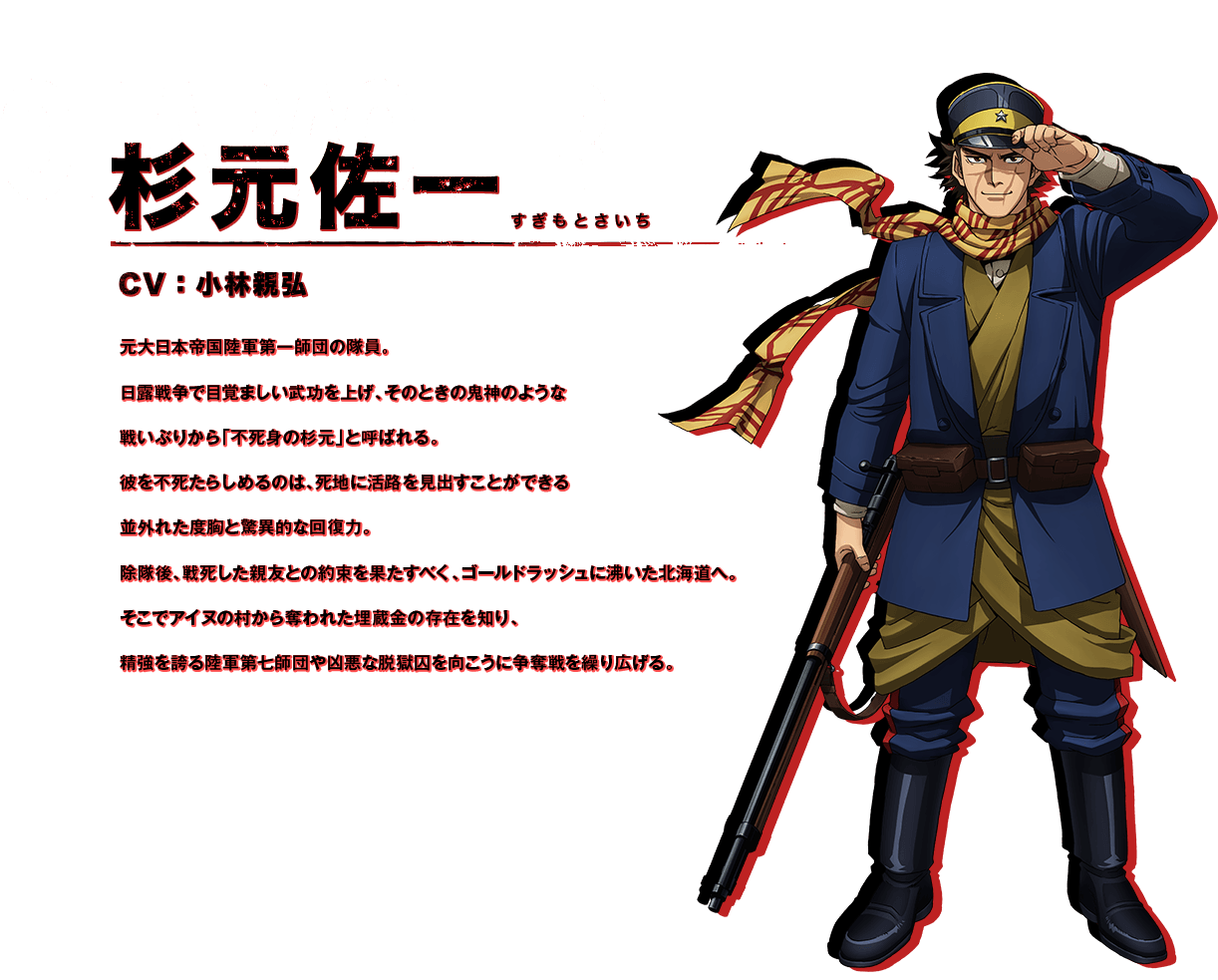 스기모토 사이치 (SUGIMOTO SAICHI)|杉元佐一 프로필 [로그] [정보수정] 프로필을 등록하여주세요. 설정화 [설정화 등록] 삭제 명대사 [명대사 등록] 명대사를 등록하여주세요. 골든 카무이 (2022)|2023.04.03 골든 카무이 (2020)|2020.10.05 골든 카무이|2018.04.09