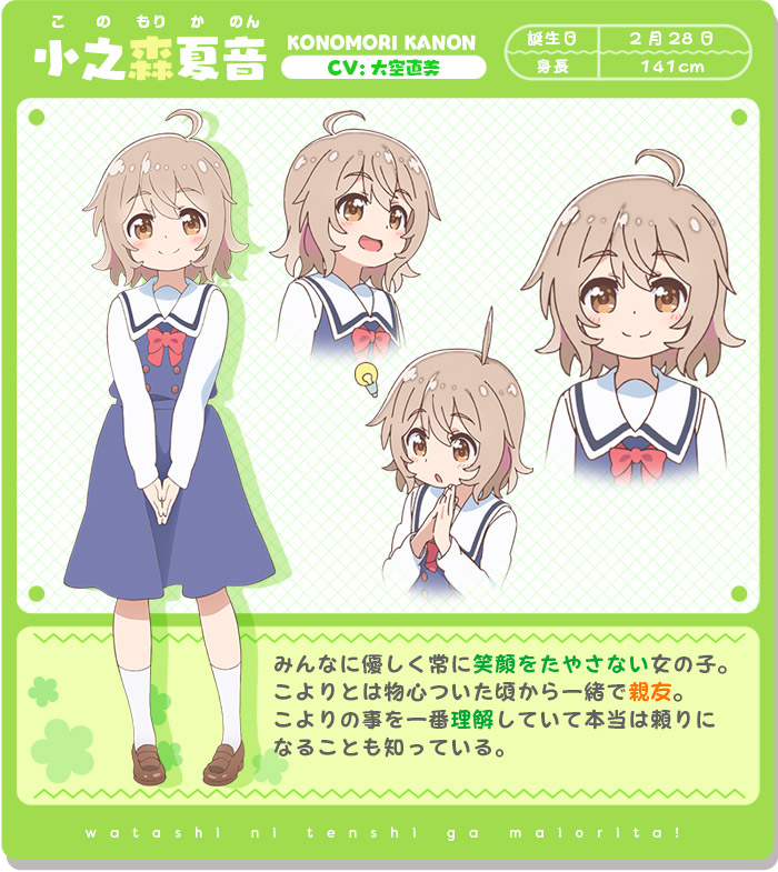 코노모리 카논 (KONOMORI KANON)|小之森夏音 생일 02.28 신장 141cm 프로필 [로그] [정보수정] 프로필을 등록하여주세요. 설정화 [설정화 등록] 삭제 명대사 [명대사 등록] 명대사를 등록하여주세요. 나에게 천사가 내려왔다! 프레셔스 프렌즈|2022.10.14 나에게 천사가 내려왔다!|2019.01.08