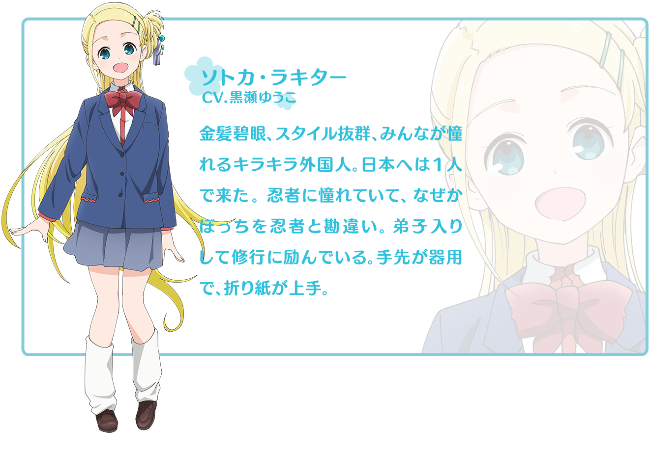 소토카 라키타 (SOTOKA RAKITA)|ソトカ・ラキター 프로필 [로그] [정보수정] 프로필을 등록하여주세요. 설정화 [설정화 등록] 삭제 명대사 [명대사 등록] 명대사를 등록하여주세요. 히토리 봇치의 ○○생활|2019.04.06