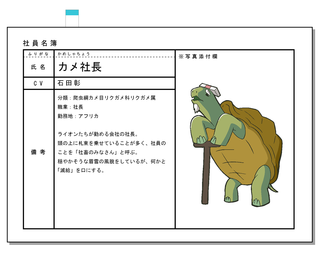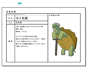 거북이 사장 (KAME-SHACHOU)|カメ社長 프로필 [로그] [정보수정] 프로필을 등록하여주세요. 설정화 [설정화 등록] 삭제 명대사 [명대사 등록] 명대사를 등록하여주세요. 아프리카의 샐러리맨 (2019)|2019.10.07