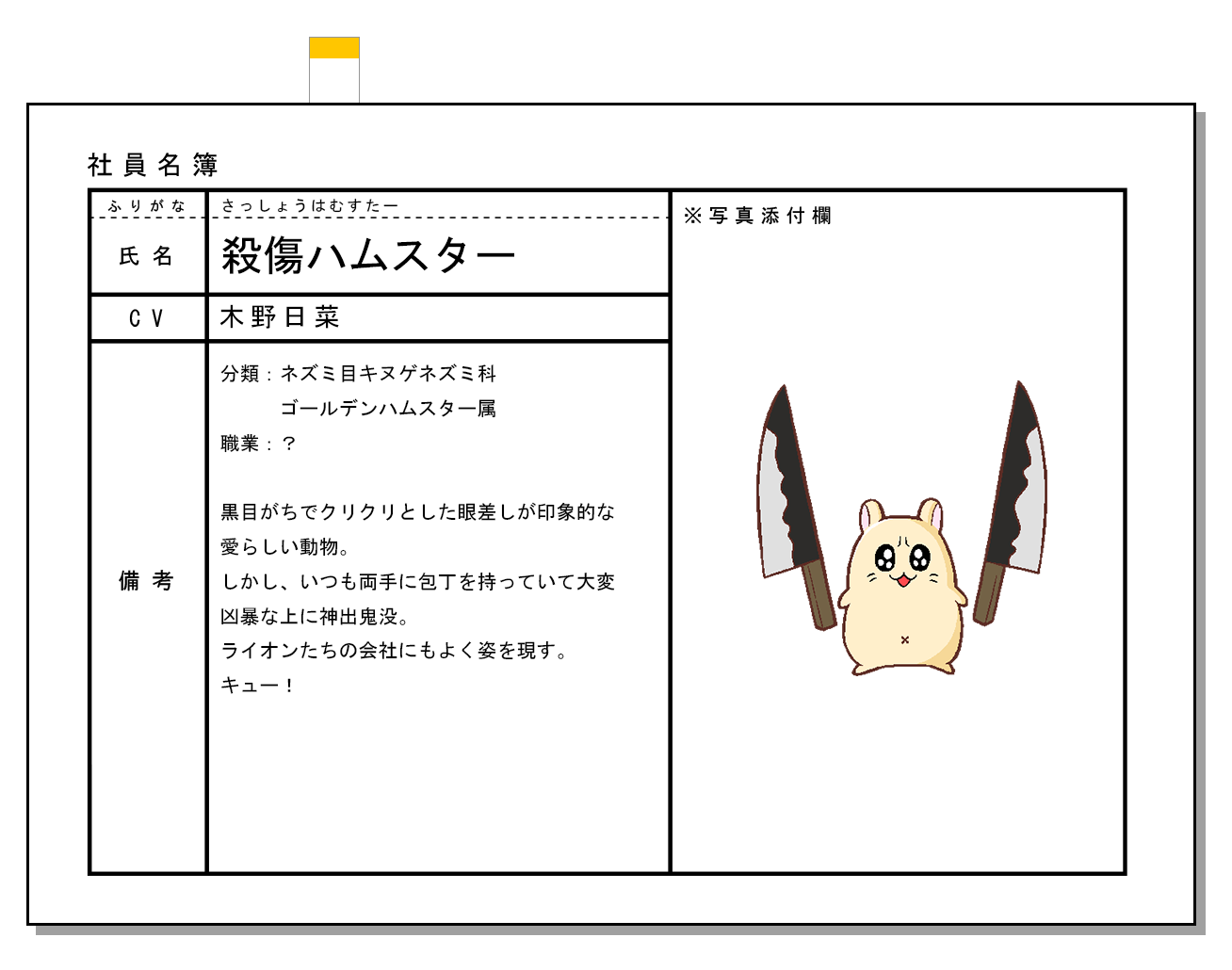 살상 햄스터 (SASSHOU-HAMUSUTAA)|殺傷ハムスター 프로필 [로그] [정보수정] 프로필을 등록하여주세요. 설정화 [설정화 등록] 삭제 명대사 [명대사 등록] 명대사를 등록하여주세요. 아프리카의 샐러리맨 (2019)|2019.10.07