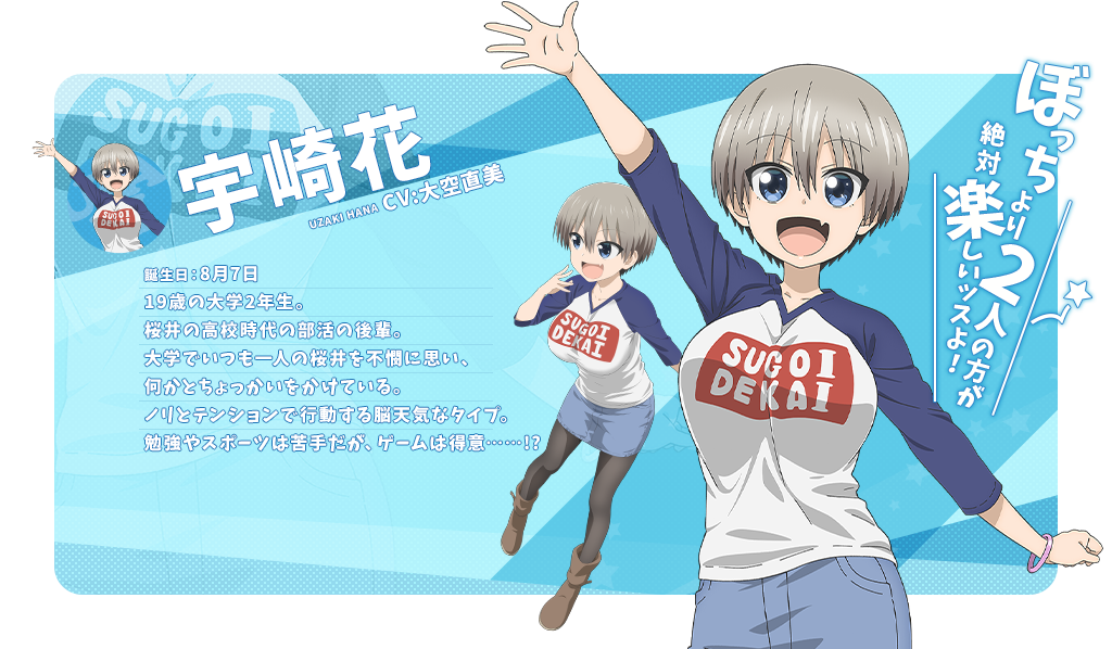 우자키 하나 (UZAKI HANA)|宇崎花 생일 08.07 신장 150cm 프로필 [로그] [정보수정] 프로필을 등록하여주세요. 설정화 [설정화 등록] 삭제 명대사 [명대사 등록] 수정삭제아싸보다 둘이 있는 편이 분명 재밌을검다! 우자키 양은 놀고 싶어! ω|2022.10.01 우자키 양은 놀고 싶어!|2020.07.10