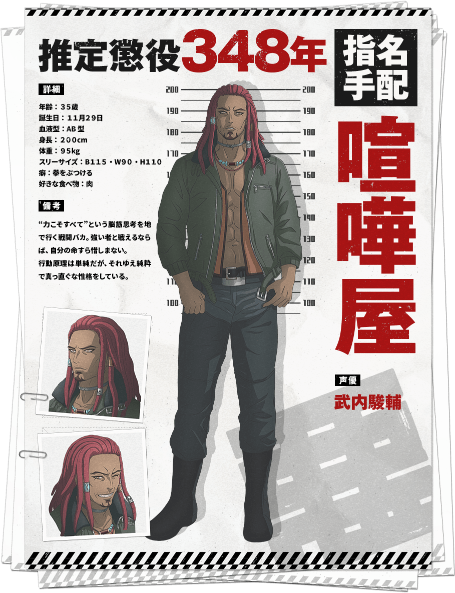 싸움꾼 (KENKAYA)|喧嘩屋 나이 35 생일 11.29 혈액형 AB 신장 200cm 사이즈 115-90-110 프로필 [로그] [정보수정] 프로필을 등록하여주세요. 설정화 [설정화 등록] 삭제 명대사 [명대사 등록] 명대사를 등록하여주세요. 아쿠다마 드라이브|2020.10.08