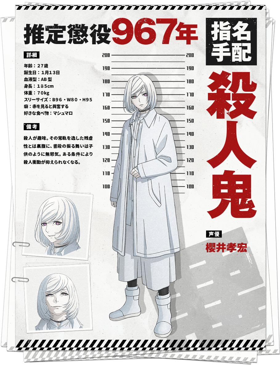 살인귀 (SATSUJINKI)|殺人鬼 나이 27 생일 01.13 혈액형 AB 신장 185cm 사이즈 96-80-95 프로필 [로그] [정보수정] 프로필을 등록하여주세요. 설정화 [설정화 등록] 삭제 명대사 [명대사 등록] 명대사를 등록하여주세요. 아쿠다마 드라이브|2020.10.08