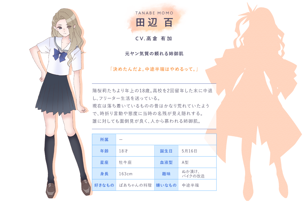 타나베 모모 (TANABE MOMO)|田辺百 프로필 [로그] [정보수정] 프로필을 등록하여주세요. 설정화 [설정화 등록] 삭제 명대사 [명대사 등록] 명대사를 등록하여주세요. 블루 리플렉션 레이|2021.04.10