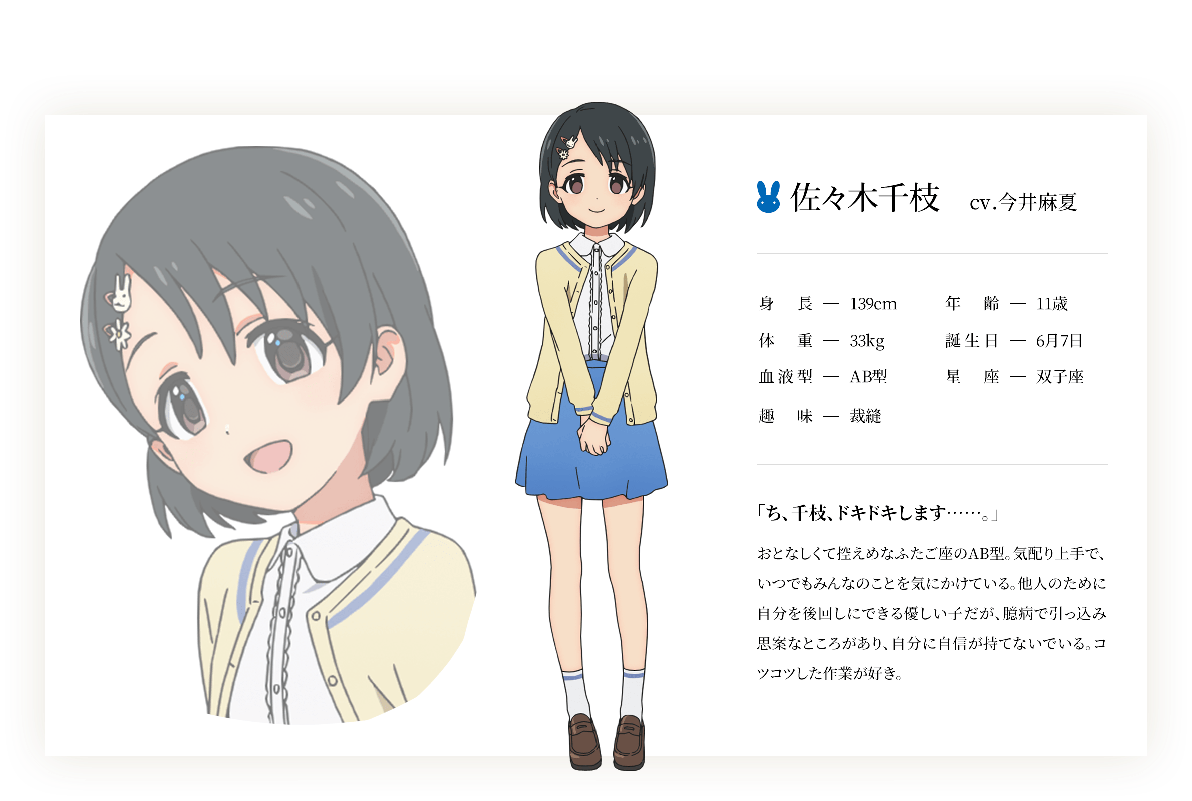 사사키 치에 (SASAKI CHIE)|佐々木千枝 나이 11 생일 06.07 혈액형 AB 신장 139cm 프로필 [로그] [정보수정] 프로필을 등록하여주세요. 설정화 [설정화 등록] 삭제 명대사 [명대사 등록] 명대사를 등록하여주세요. 아이돌마스터 신데렐라 걸즈 U149 OVA|2023.10.25 아이돌마스터 신데렐라 걸즈 U149|2023.04.06 아이돌 마스터 신데렐라 걸즈|2015.01.10