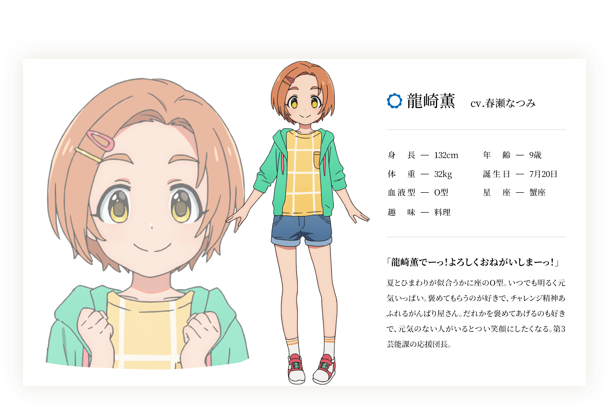 류자키 카오루 (RYUUZAKI KAORU)|龍崎薫 나이 9 생일 07.20 혈액형 O 신장 132cm 프로필 [로그] [정보수정] 프로필을 등록하여주세요. 설정화 [설정화 등록] 삭제 명대사 [명대사 등록] 명대사를 등록하여주세요. 아이돌마스터 신데렐라 걸즈 U149 OVA|2023.10.25 아이돌마스터 신데렐라 걸즈 U149|2023.04.06