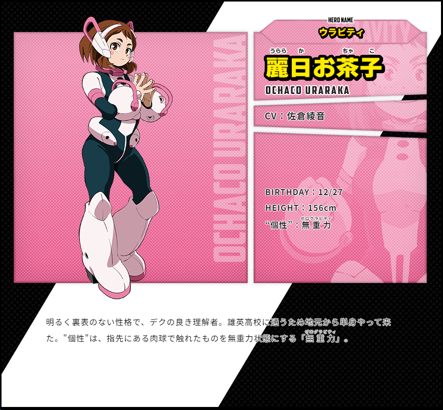 우라라카 오챠코 (URARAKA OCHAKO)|麗日お茶子 프로필 [로그] [정보수정] 프로필을 등록하여주세요. 설정화 [설정화 등록] 설정화를 등록하여주세요. 명대사 [명대사 등록] 명대사를 등록하여주세요. 나의 히어로 아카데미아 (2024)|2024.05.04 나의 히어로 아카데미아 (2022)|2022.10.01 나의 히어로 아카데미아 (2021)|2021.03.27 나의 히어로 아카데미아 The Movie 히어로즈 라이징|2019.12.20 나의 히어로 아카데미아 (2019)|2019.10.12 나의 히어로 아카데미아 3|2018.04.07 나의 히어로 아카데미아 2|2017.04.01 나의 히어로 아카데미아|2016.04.03