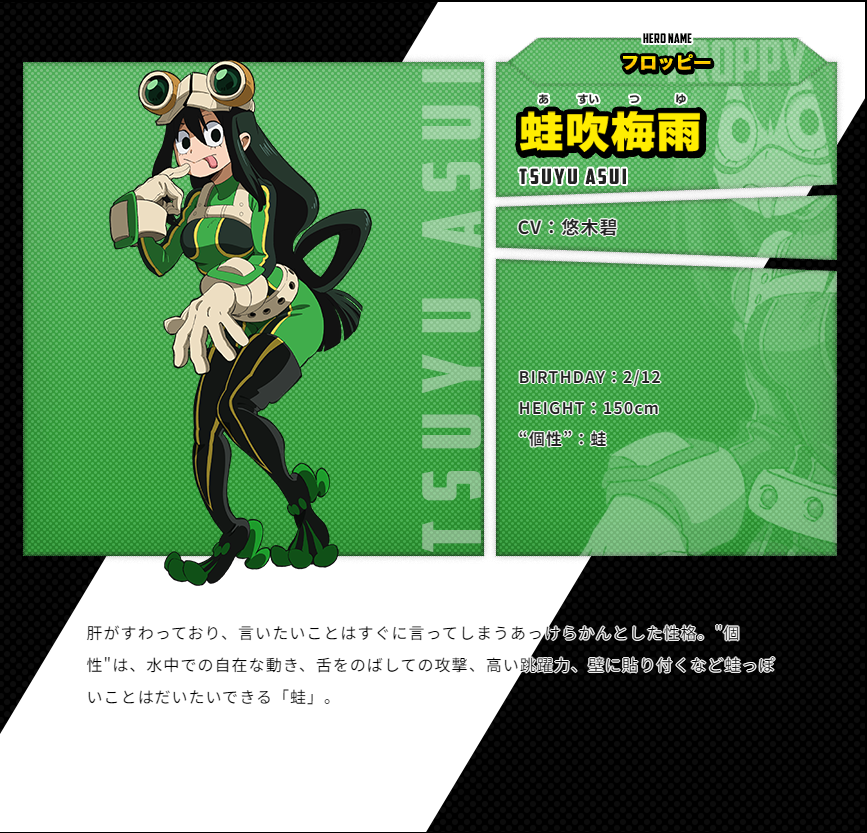 아스이 츠유 (ASUI TSUYU)|蛙吹梅雨 생일 02.12 혈액형 B 신장 150cm 프로필 [로그] [정보수정] 프로필을 등록하여주세요. 설정화 [설정화 등록] 설정화를 등록하여주세요. 명대사 [명대사 등록] 명대사를 등록하여주세요. 나의 히어로 아카데미아 (2024)|2024.05.04 나의 히어로 아카데미아 (2022)|2022.10.01 나의 히어로 아카데미아 (2021)|2021.03.27 나의 히어로 아카데미아 (2019)|2019.10.12 나의 히어로 아카데미아 3|2018.04.07 나의 히어로 아카데미아 2|2017.04.01 나의 히어로 아카데미아|2016.04.03