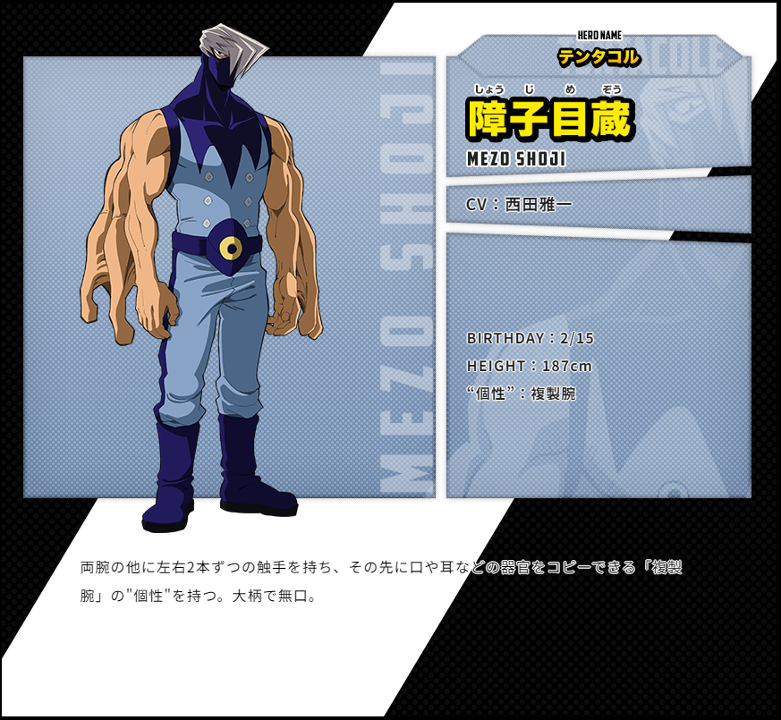 쇼지 메조 (SHOUJI MEJOU)|障子目蔵 프로필 [로그] [정보수정] 프로필을 등록하여주세요. 설정화 [설정화 등록] 설정화를 등록하여주세요. 명대사 [명대사 등록] 명대사를 등록하여주세요. 나의 히어로 아카데미아 (2024)|2024.05.04 나의 히어로 아카데미아 2|2017.04.01 나의 히어로 아카데미아|2016.04.03