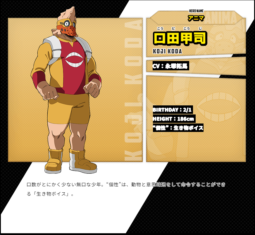 코다 코지 (KODA KOJI)|口田甲司 프로필 [로그] [정보수정] 프로필을 등록하여주세요. 설정화 [설정화 등록] 설정화를 등록하여주세요. 명대사 [명대사 등록] 명대사를 등록하여주세요. 나의 히어로 아카데미아 (2024)|2024.05.04