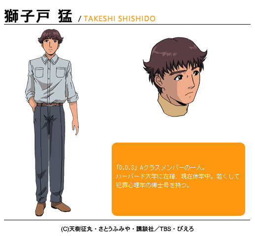 시시도 다케시 (SHISHIDO TAKESHI)|獅子戸猛 프로필 [로그] [정보수정] A 클래스의 학생. 전세계 천재들이 모인다는 하버드 대학교에서 범죄심리학 박사 자격을 따낸 인물. 설정화 [설정화 등록] 설정화를 등록하여주세요. 명대사 [명대사 등록] 명대사를 등록하여주세요. 탐정학원Q|2003.04.15